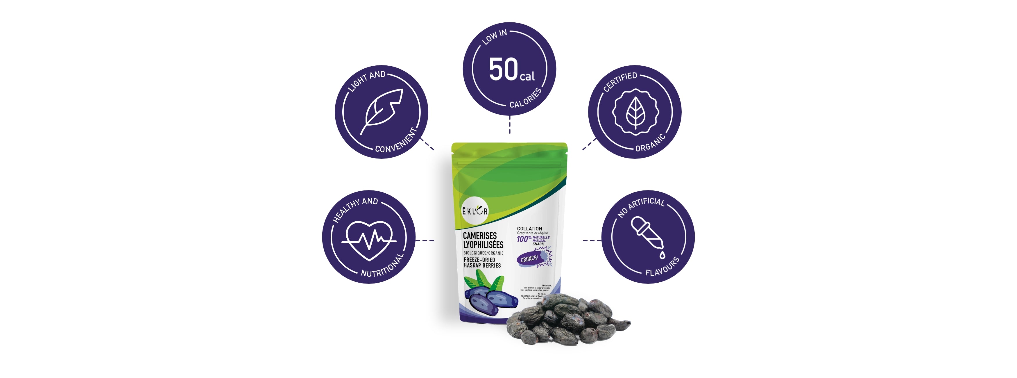 Freeze-dried organic haskap berries are not only a delicious snack, they’re also a rich source of antioxidants and essential vitamins. Thanks to their crunchy texture and intense flavour, they go great in a variety of recipes and create incredible taste sensations: